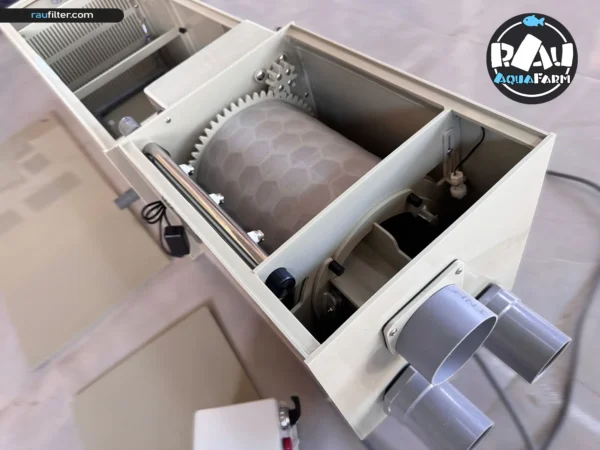 Boasting a rugged design, this rotating drum filter stands as a prime choice for seafood farms, fish farms, aquaponics farms, and expansive ponds, ensuring optimal filtration efficiency.