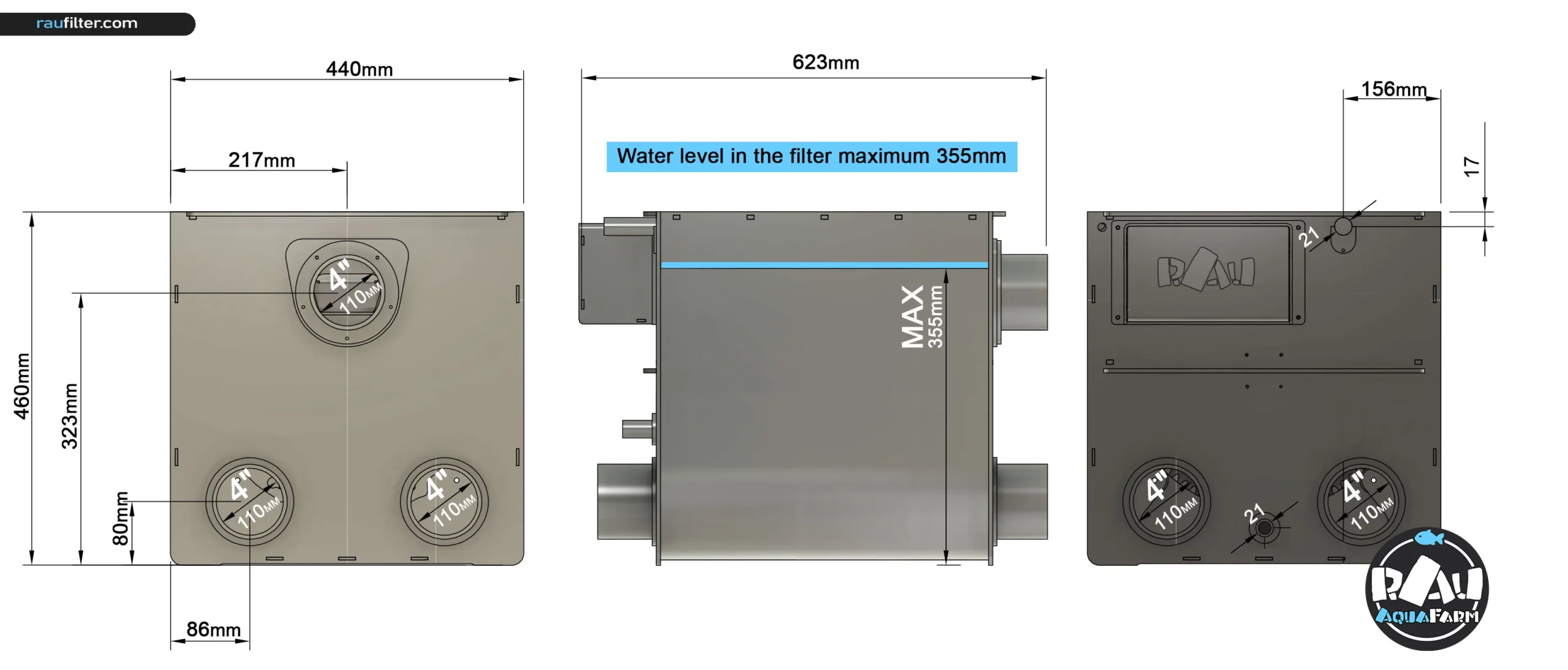 - Pipes: 2 inlets, 2 outlets, compatible with 3″ and 90 mm
